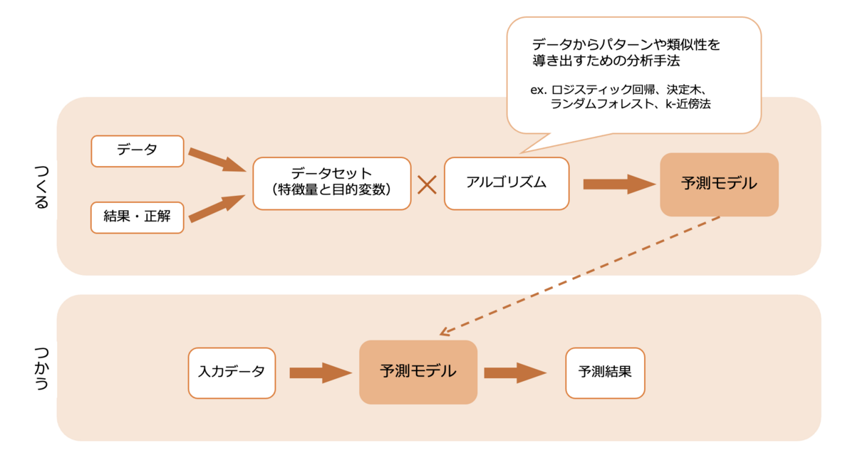 予測モデルの作成フローは冒頭にご説明したとおり、前処理したデータでデータセットを作成して、アルゴリズムにかけるという流れになっています。
