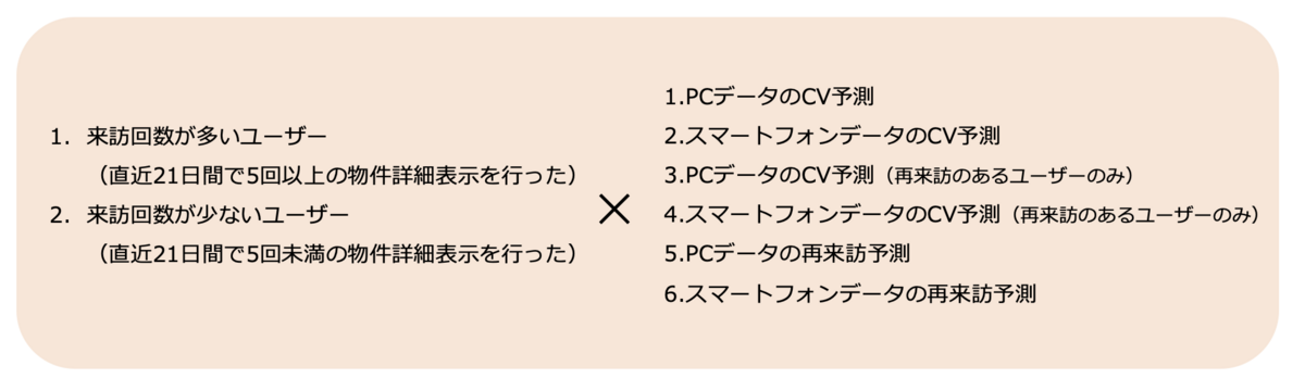 先ほどの図に当てはめると、データはユーザー行動ログ、結果は反響の有無と再来訪の有無といえます。ユーザーの来訪回数と使用端末に応じて、以下の12パターンのモデルを作成しています。