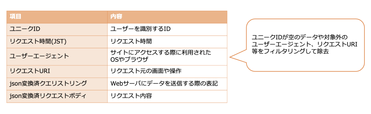 ユーザー行動ログからユニークID、リクエスト時間、ユーザーエージェントといった項目を抽出し、不要なデータをフィルタリングします。